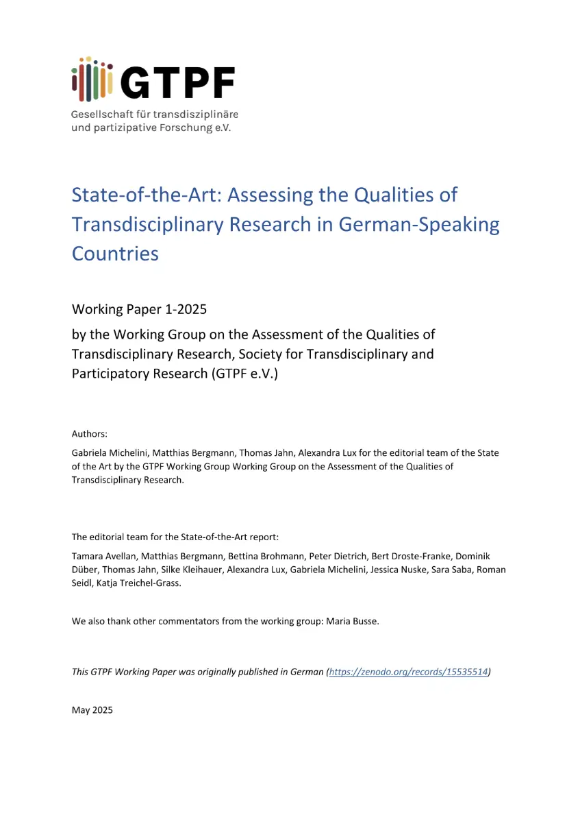 The Working Paper 1-2025 by the Working Group on the Assessment of the Qualities of Transdisciplinary Research, Society for Transdisciplinary and Participatory Research (GTPF AG) provides an overview of the current state of knowledge (State-of-the-Art) regarding quality criteria in transdisciplinary research with a focus on the German-speaking discourse.